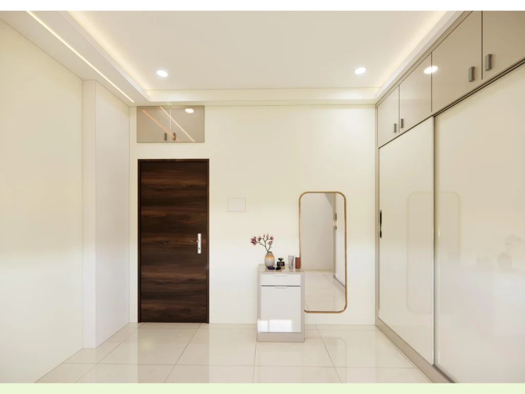 Both the master and secondary bedrooms feature semi-modular wardrobes and storage solutions. This setup provides greater customisation while maintaining a sleek and contemporary look. By blending fixed carpentry with modular elements, the design ensures flexibility, cost-effectiveness, and lasting comfort.